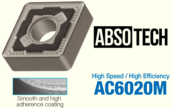 Grado para el torneado de acero inoxidable de alta velocidad y alta eficiencia mediante la combinación del nuevo recubrimiento CVD «Absotech®» y un sustrato duro con alta resistencia al desgaste, tiene una excelente resistencia al desgaste, astillado o desprendimiento.