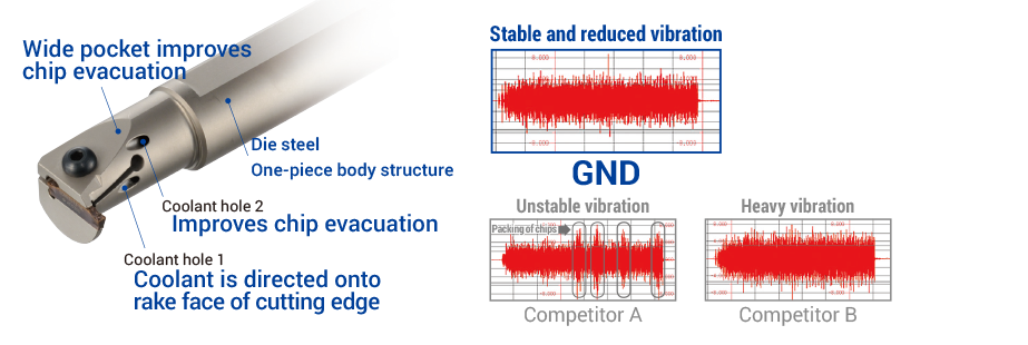 Utilizando acero para matriz y una construcción de una sola pieza para lograr un mecanizado estable al suprimir el ruido no solo en las operaciones de ranurado sino también en las de torneado, perfilado y refrentado.