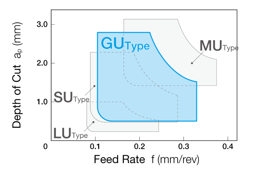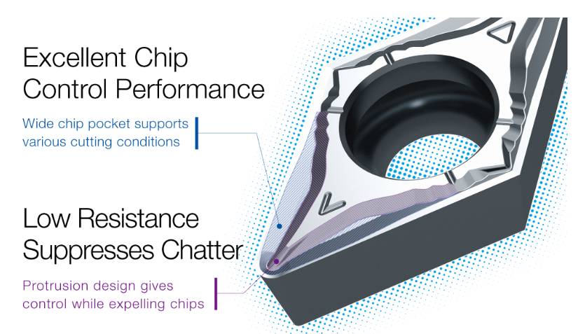 El diseño de la forma del rompevirutas caracterizado por un amplio bolsillo de virutas ha mejorado el control de las virutas en una amplia gama de condiciones de corte. Esto evita el atasco de virutas durante el proceso de corte y logra un mecanizado estable. Además del acero de aleación, también es aplicable a varios materiales de trabajo, incluidos el acero al carbono y el acero inoxidable.