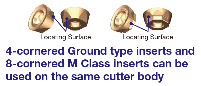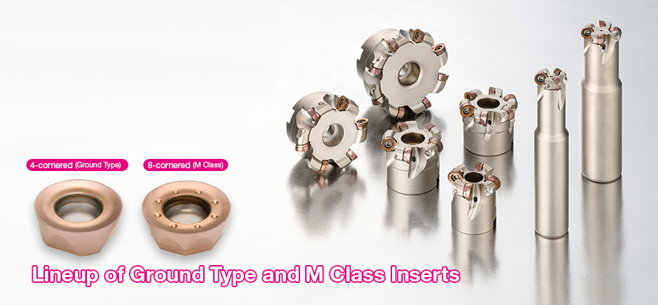 Además de los insertos de tipo Ground de 4 esquinas, también están disponibles los económicos insertos de clase M de 8 esquinas. El cuerpo de la fresa puede ser compartido optimizando el diseño de la superficie de localización.