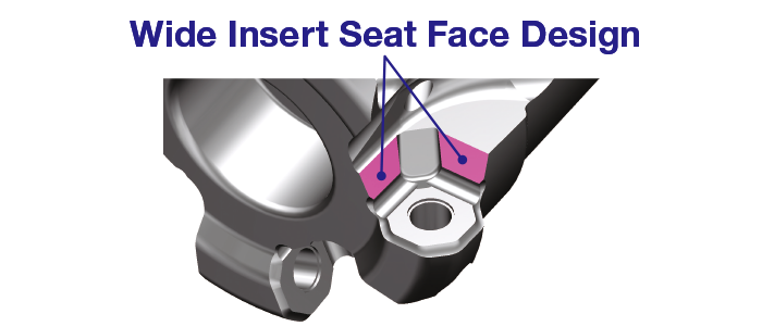 El diseño amplio de la cara del asiento del inserto logra una excelente durabilidad, para el mecanizado de alta eficiencia de acero inoxidable, etc., e es ideal para el desbaste de componentes aeroespaciales como las palas de turbina.
