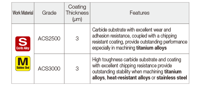Utilizando los grados ACS2500/ACS3000 recientemente desarrollados para lograr una vida útil estable y larga en el mecanizado de aleaciones exóticas, como las aleaciones de titanio y las aleaciones resistentes al calor a base de Ni, así como en acero inoxidable .