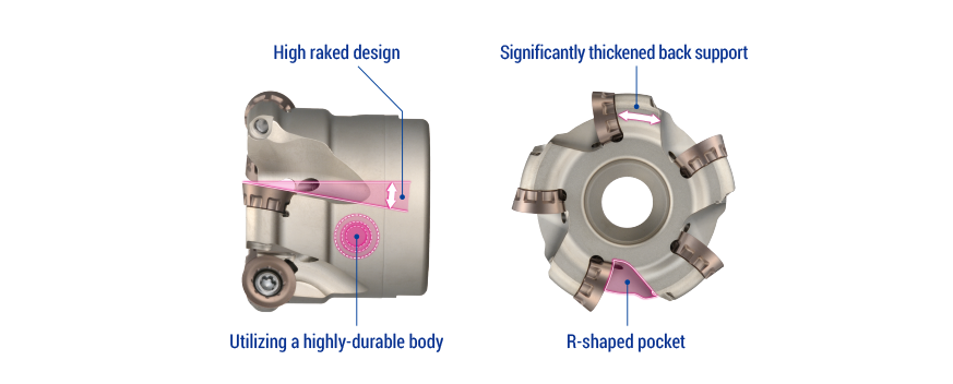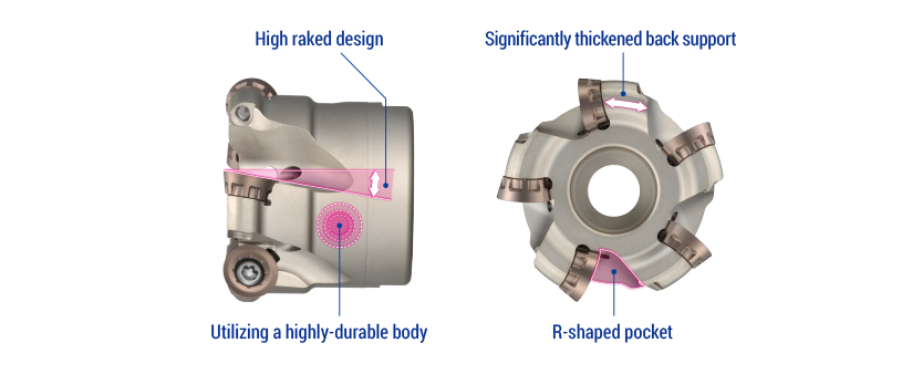 Logra un mecanizado de baja fuerza de corte y pocas vibraciones con un diseño de cuerpo de herramienta superalto ángulo de ataque y alta rigidez.