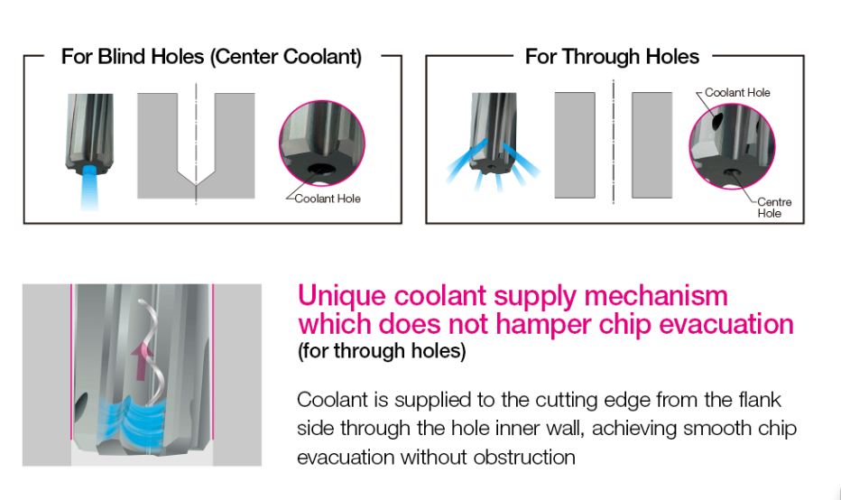 Mecanismo de suministro de refrigerante único que no obstaculiza la evacuación de virutas (para agujeros pasantes).