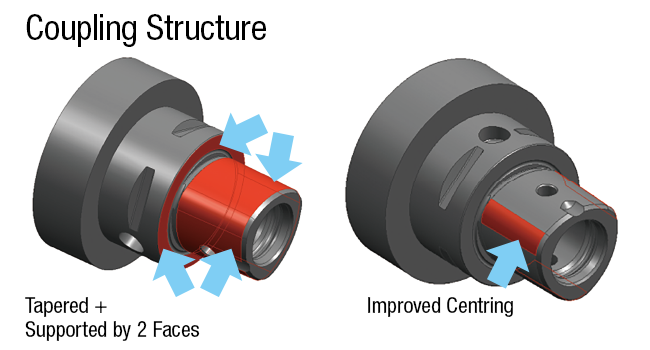 ● Alta rigidez y alta precisión: La restricción de dos superficies mediante un cono poligonal de 1/2 y la cara final ofrecen alta rigidez.